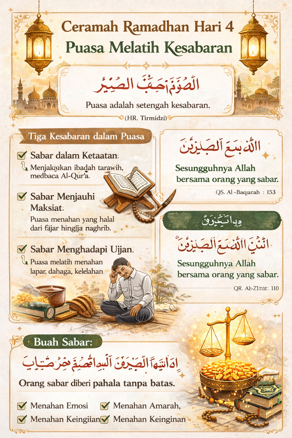 Bangun sahur, shalat tarawih, membaca Al-Qur’an — semua membutuhkan kesabaran. Orang yang sabar dalam taat akan merasakan manisnya ibadah.